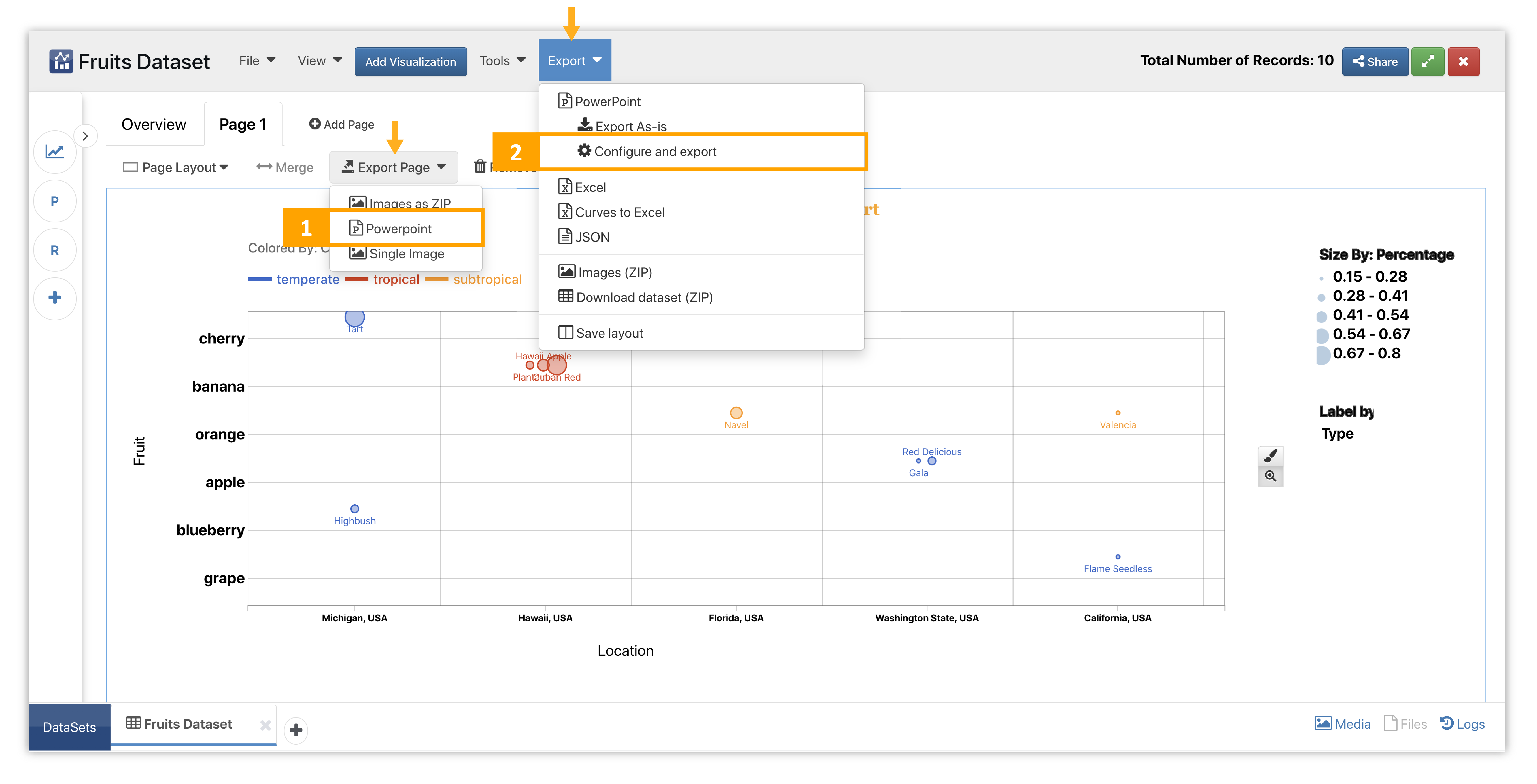 The PowerPoint builder allows us to add text, images, arrows, slides and other visualizations. It also supports editing visualizations directly and importing slide layouts. We can access the PowerPoint builder from the page or dataset export menu as discussed in the above subsections.