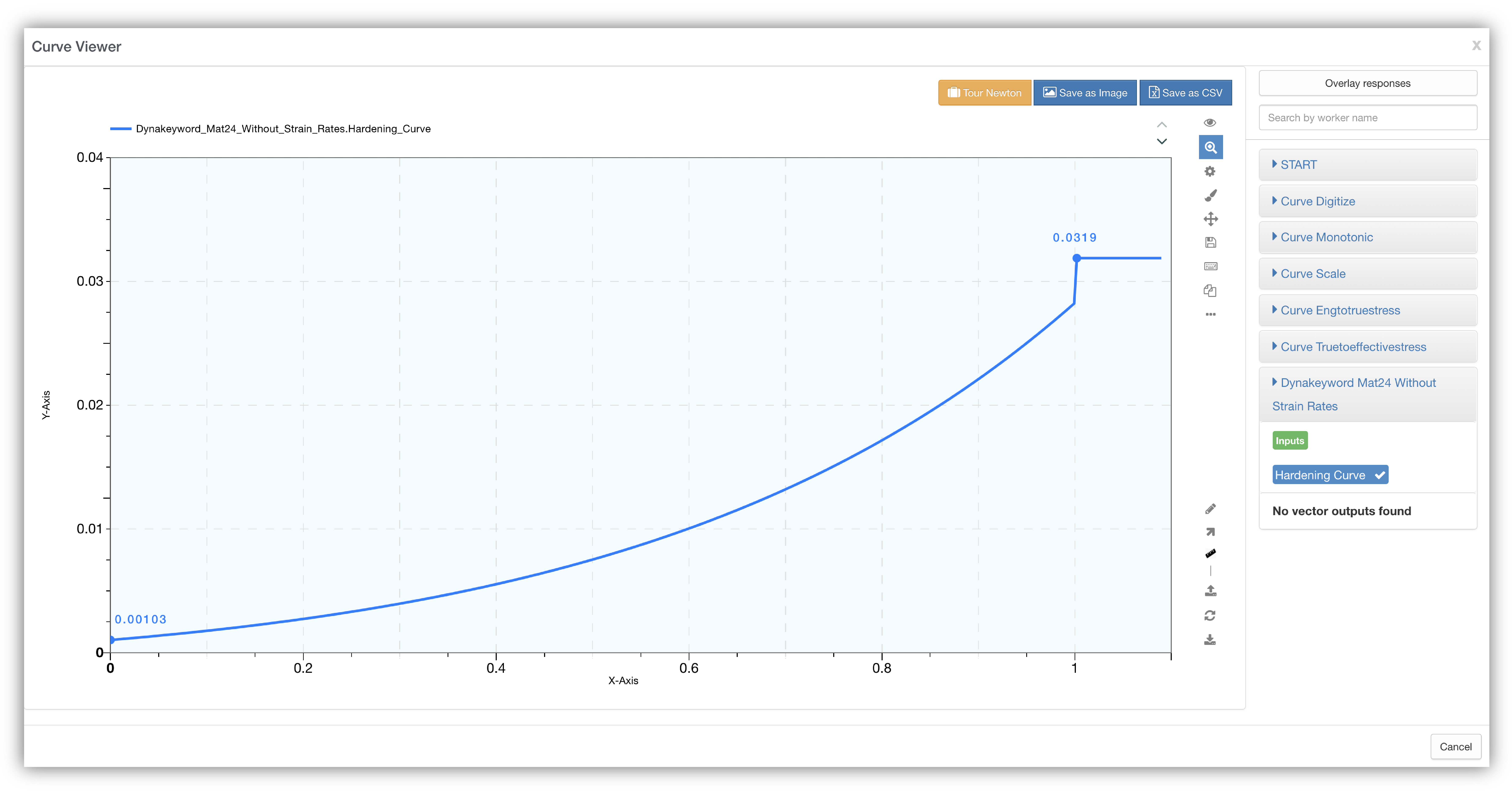 - Next, add the ‘Curve Eng to True Stress’ (curve_engtotruestress) worker and input:
