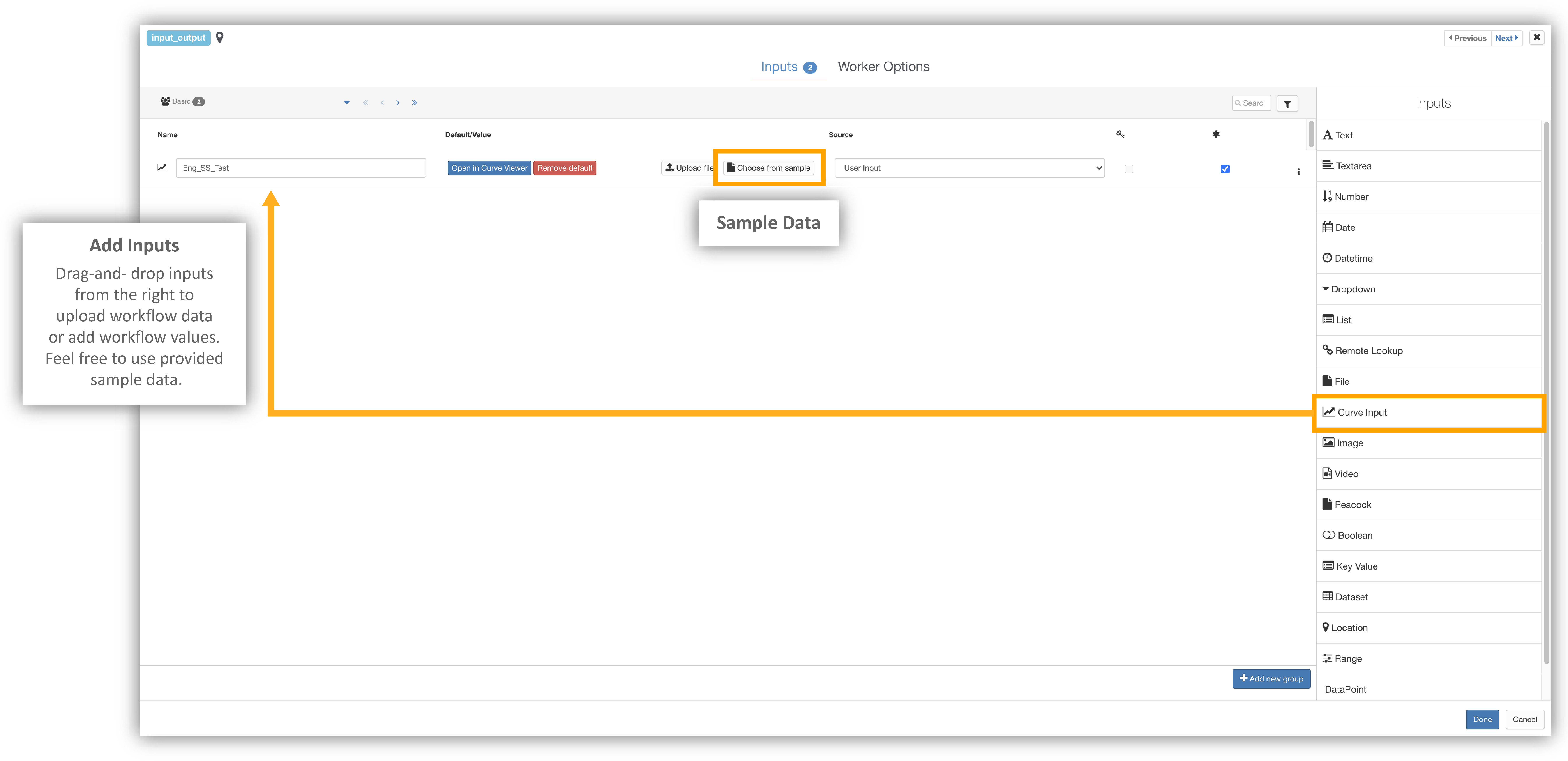 - Click on the worker to edit the inputs. Select DataSource for the Curves input as Previous worker>Start>name of the curve (in this case Eng SS Test)