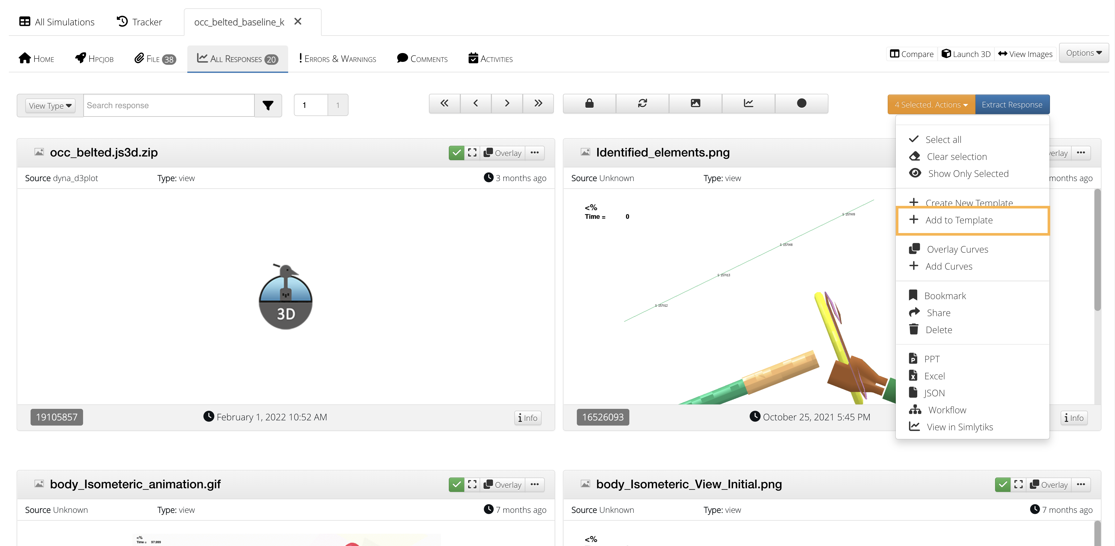 Templates help turn data into information and automate the process of extracting information from raw simulations or experimental files. They are used in post processing to extract, transform and store all the required responses from a simulation or physical test automatically after the job is solved. Templates can extract from multiple parallel simulations and scale to thousands of simulations at the same time. Basically, they are a group of responses and transformations saved by users to reuse later for other simulations or physical tests.