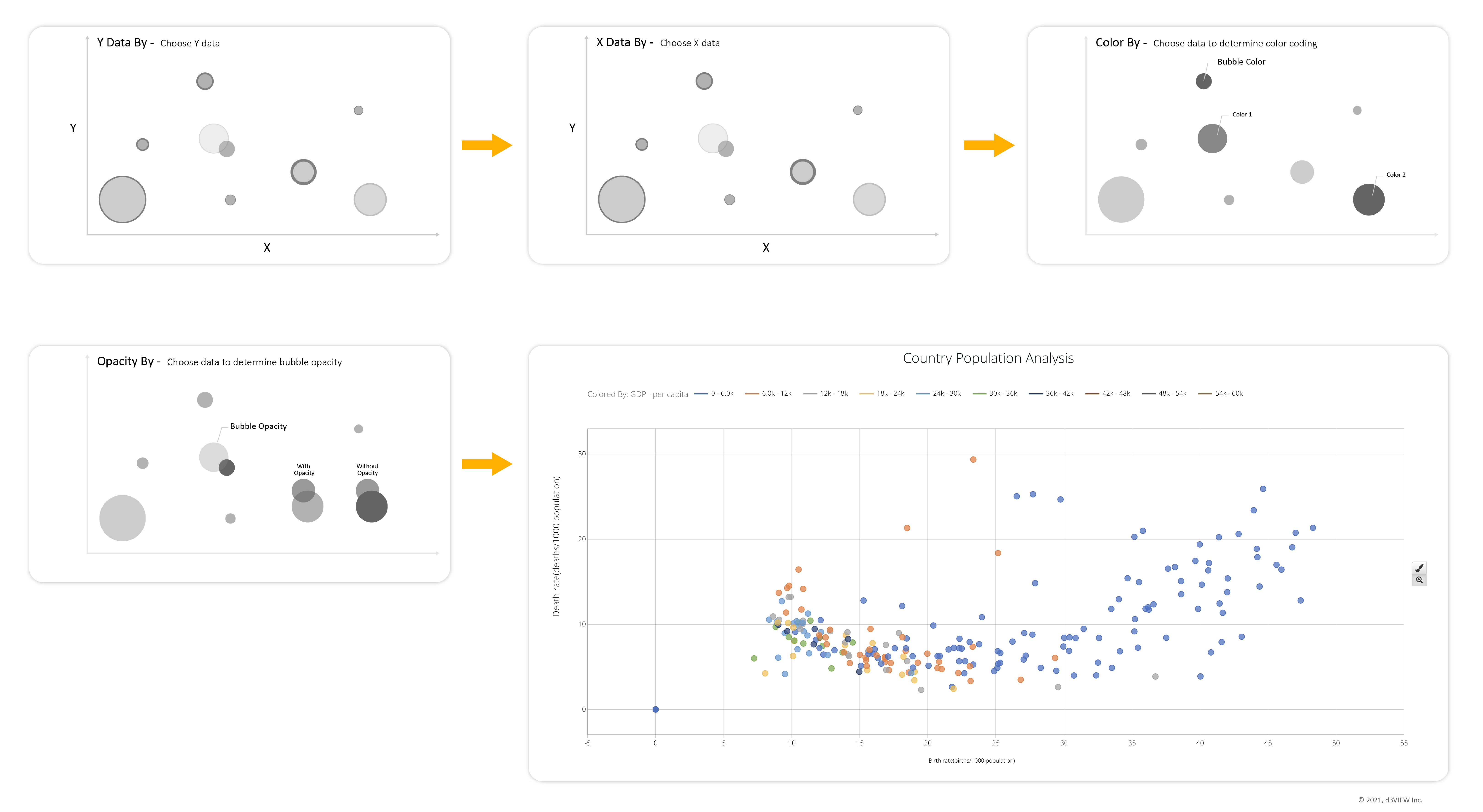 As d3VIEW is focusing on taking its users’ experience to the next level, Simlytiks, which is our visualization application has been spruced up. We have been working on extending functionality to improve usability and understanding of Simlytiks. One important improvement in the works pertains to the visualization placeholders – what the user sees before picking specifications for a chart, graph, etc. The updated placeholder images show detailed illustrations of each option available for each visualization. The key intention involves adding more clarity, so users feel empowered to create effective visualizations without any hesitation. Let’s go over some examples of how these extensive illustrations aid in setting up remarkable visualizations quickly.