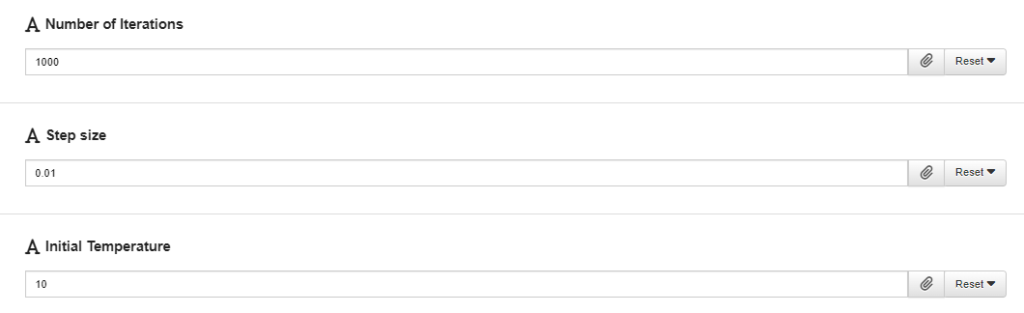 The parameters “iterations”, “step_size” and “initial_temp” controls the process of the SA algorithm. Their values may need to be carefully tuned as performance of the SA algorithm on different datasets vary.