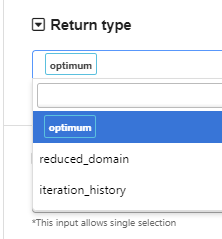 By default, it returns the optimum point from the optimization process. We can also let it return the domain information (reduced domain if the shrink_factor is between 0 and 1) or the tracking history of the best point at each iteration, by selecting the “return_type”. When normalization is specified, the output will be shown in the original scale without normalization.