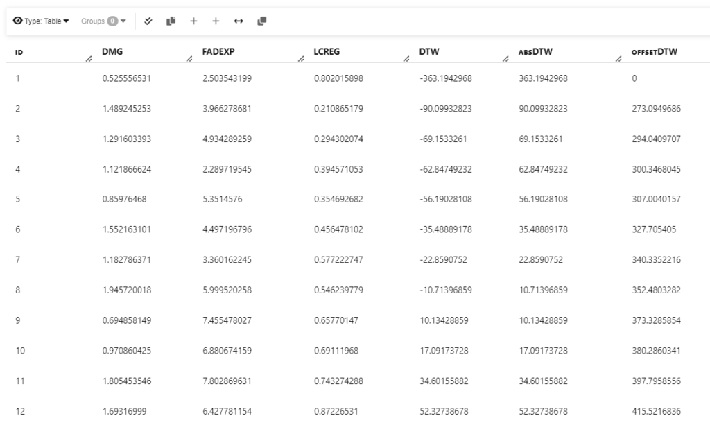 The following dataset provide parameters for generating the Force-deflection curves. The DTW values is a measure how far each simulation curve from the test curve.