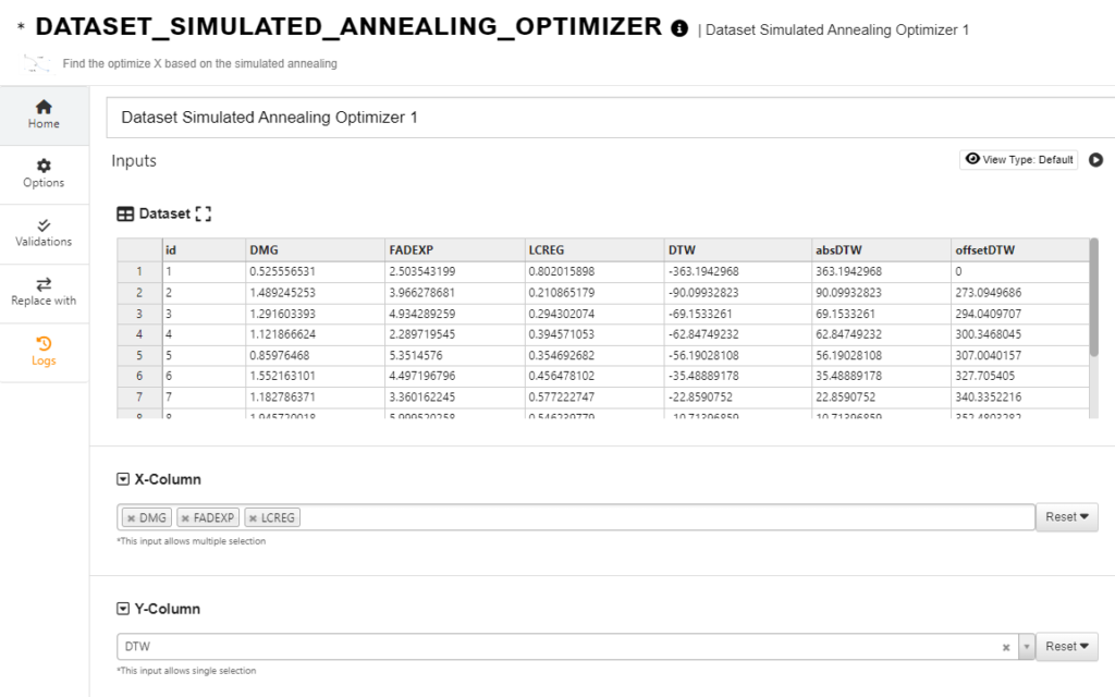 In d3VIEW Workflow, there is a worker “dataset_simulated_annealing_optimizer” to perform the SA optimization. First, we upload the dataset and select the input and target variables (X and Y columns).