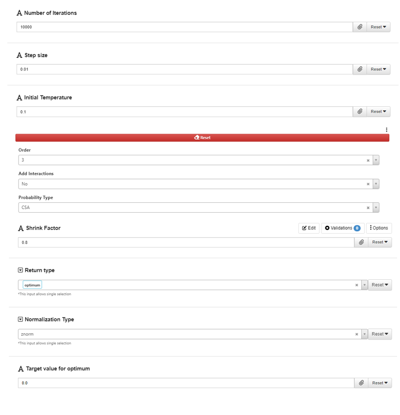 For every 100th iteration, we stop and “zoom in” to the region centered at the current best point we obtained and run the SA algorithm there locally. We compare the optimum value from this local region and compare it to the best point and update the global best point when necessary. This procedure is activated when the “shrink_factor” is between 0 and 1 (exclusive). It shrinks the range for each variable from the original domain to a certain percentage (value of the parameter shrink_factor) centered at the current global best point. When the new reduced domain is determined, we run the SA algorithm on this region to find the optimum. This will generate a new polynomial regression model with the same parameters on a smaller domain. It will depict a more accurate local surface that can be used as the objective function.