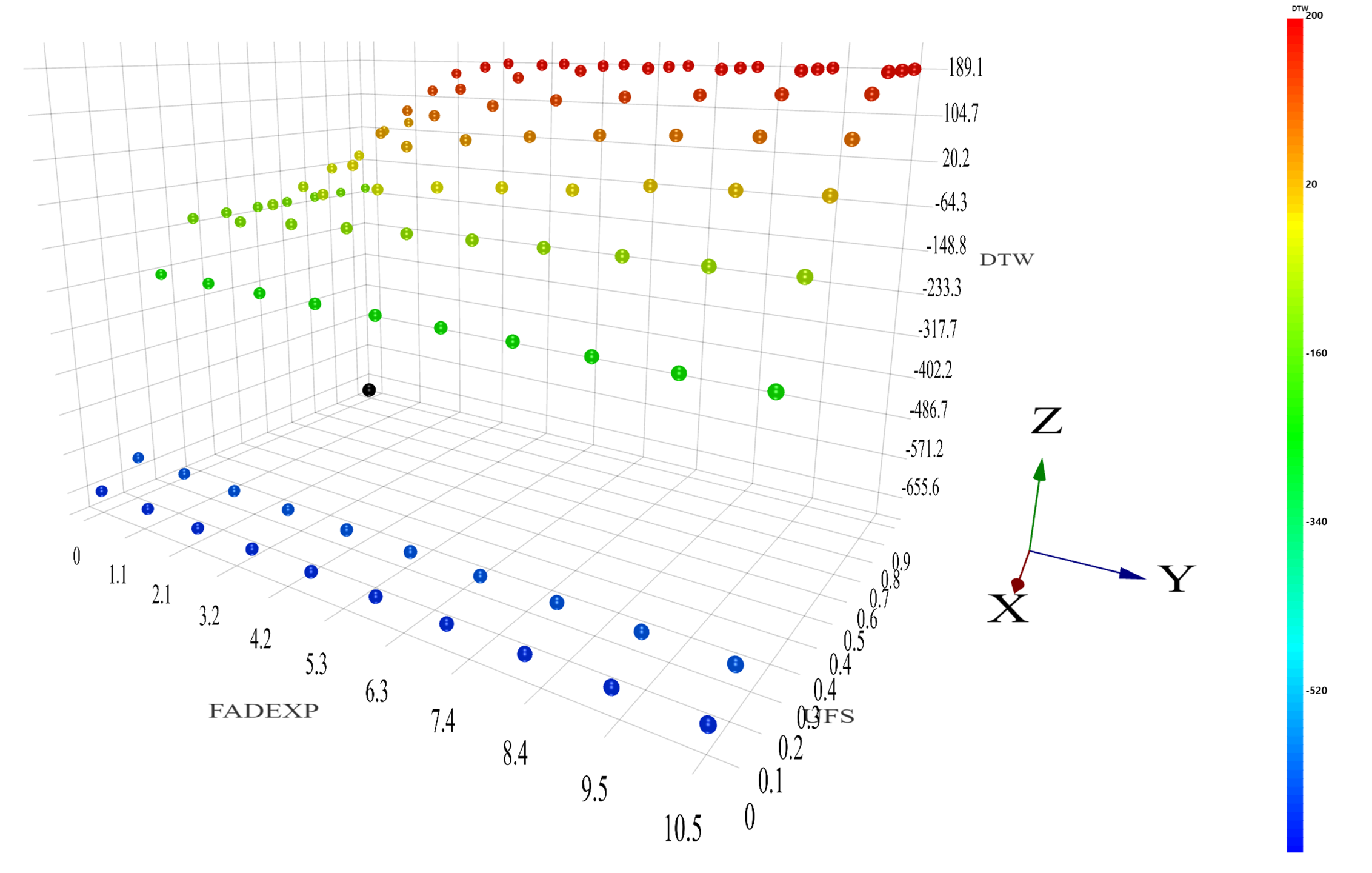 We start with a reference FD curve generated from simulation using UFS = 0.4 and FADEXP = 8. We want to find a set of values for parameter UFS and FADEXP that generates a curve that will be very close to the reference curve we have. In order to compare the similarity of two curves, we use Dynamic Time Warping score (DTW) as a metric. If two curves are perfectly overlapping with each other, we get DTW = 0. Otherwise, two different curves will result in a non-zero DTW score that indicates how different the two curves are. A larger the DTW score implies larger difference.