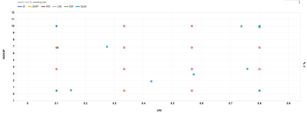 There are four main sampling types : Full Factorial Design (FFD), D-Optimal Design (DOPT), Latin Hypercube (LHS), and Space Filling (SF). In addition to these four basic designs, we can combine any two sampling types to get a new design. We will consider DLHS (a combination of DOPT and LHS design), DSF (a combination of DOP and SF design), and LS ( a combination of LHS and SF design). We sample 16 points for FFD, 4 points for DOPT, LHS, and SF. This will give us 8 points for DLHS, DSF, and LS.
