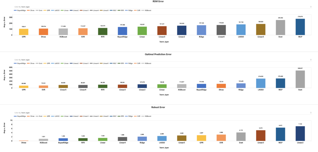 Based on learning type, the difference of top models are not very significant. GPR, SVR, RFR perform well in terms of RSM Error and Optimal Prediction Error. Dtree, XGBoost, BayesRidge and RFR models perform well in Robust Error.