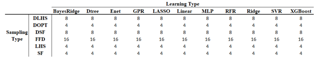 Each sampling type has their unique characteristics. Combining with different learning types, we get some very useful RSM models. Among these models, LS combined with XGBoost, Dtree, RFR, SVR and GPR as their learning model generally have a more accurate and robust RSM model.
