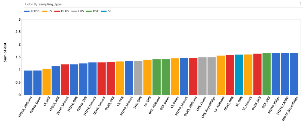 We are interested in a combination of sampling type and learning type using the least number of points that will have the lowest errors. Pareto Front Optimizer uses these criteria and assigns a distance score (dist) to each of the RSM model based on how far away they are from the ideal point (a point with the lowest errors and least number of points).