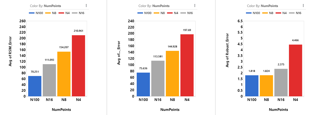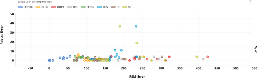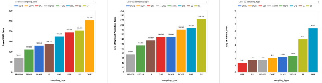 Since sampling type is associated with the number of points, it is expected that designs with more points will have lower errors. Excluding FFD designs, we see that LS has lower RSM Error, Optimal Prediction Error and Robust Error.