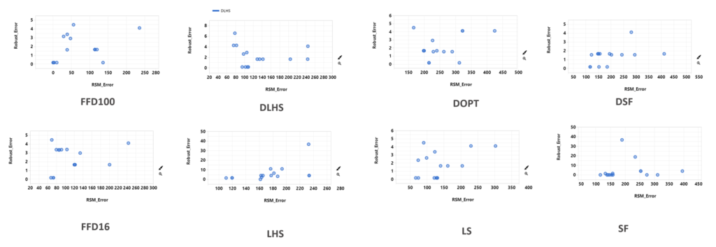 FFD points are evenly distributed in the design space. DOPT points occupy the four corners. LHS has at least one point that can represent each region of the design space. Comparing to DOPT points, LHS points gather more information about the design space. SF points are not as scattered as LHS points, but better than DOPT points.